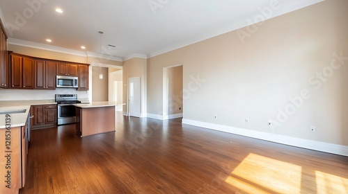 Spacious and Modern Empty Kitchen and Living Room Interior with Natural Light : Generative AI