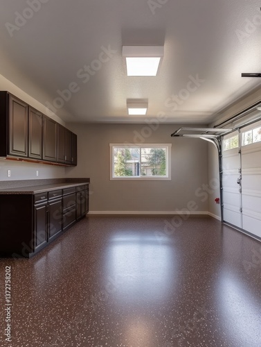 Spacious Garage Interior with Brown Cabinets and Epoxy Flooring Bright and Organized Home Storage Solution