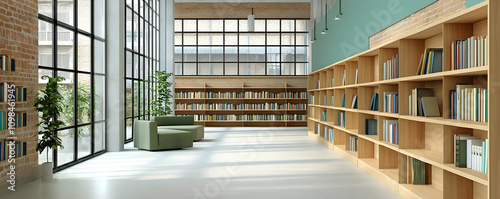 library, bookshelf, wooden, armchair, green, roomy, interior, design, reading, book, room, light, sunlit, calm, peaceful, quiet, modern, contemporary, minimalist, architecture, building, window, industrial, loft, brick, wall, floor, seating, furniture, cosy, comfortable, relaxing, home, office, study, cognition, education, literature, shelf, wood, natural light, interior design, bookcase, bright, airy