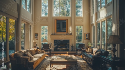 Spacious living room with large windows, elegant furniture, and warm lighting, creating a cozy and inviting atmosphere.