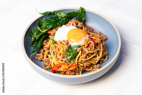 spaghetti with spicy basil beef and egg