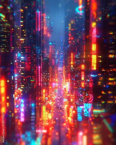Sparkling Neon Cityscape, Futuristic Skyscrapers, Glowing Streets, Digital Holograms, Vibrant Technicolor, Algorithmic Art