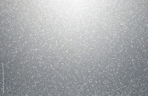 Sparkling silver glitter background. Tiny glitters shine reflecting light. Festive holiday backdrop, great for Christmas New Year greeting cards, product presentation. Glamourous silver texture,
