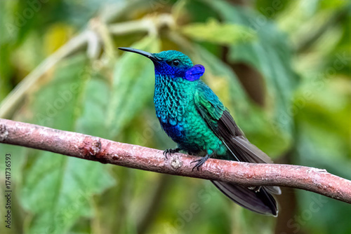 Sparkling Violetear Hummingbird Perched on a Branch in Lush Green Forest