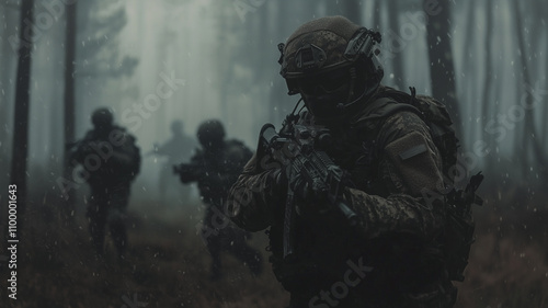 special forces unit advances through misty forest, weapons ready, in tense and focused operation. soldiers are equipped with tactical gear, moving stealthily through trees