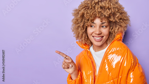 Special offer concept. Curly haired woman smiles pleasantly points index finger on blank space dressed in orange jacket recommends something isolated over purple background copy space for your advert