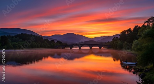 sunset, bridge, water, river, landscape, nature, sky, dawn, scenic, mist, outdoors, tranquil, peaceful, serene, orange, red, purple, mountain, tree, forest, calm, boat, idylli, beauty, travel, tour tourism, dusk, countryside, highland, scotland, architecture, landmark, picturesque, romantic, wilderness, horizon, panorama, environment, vacation, exploration, adventure, destination, ecology