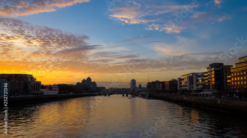 Spectacular sunset over River Liffey in Dublin, Ireland with blue orange gradient sky and dramatic clouds