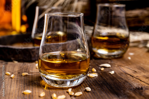 Speyside scotch whisky tasting on old dark wooden vintage table with barley grains