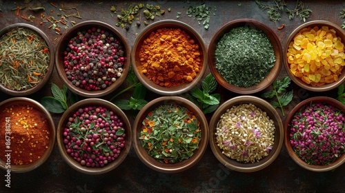 Spice Market: an assortment of colorful spices in bowls and scattered across a textured surface, evoking the vibrancy of a spice market.