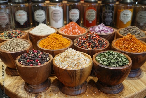 Spice-filled Wooden Bowl in Busy Kitchen: Aromas Infuse Culinary Masterpiece