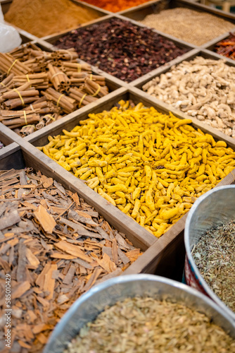Spices and herbs for sale in a market