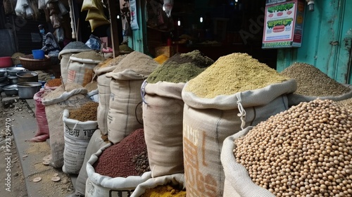 spice, market, bag, sack, stall, food, store, shop, selling, ingredient, grocery, shopkeeper, trade, retail, produce, agriculture, product, ground, powdered, favor, flavouring, variety, selection, of, colourful, brown, beige, yellow, green, red, orange, white, texture, closeup, close, up, horizontal, daylight, photo, daytime, street