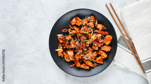 spicy chicken in sweet and sour sauce with chili pepper. teriyaki chicken's with sesame seeds. Chinese cuisine, Thai cuisine. Japanese food, copy space, recipe background, food flat lay