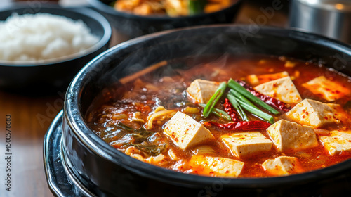 Spicy Hot Soup with Tofu, Vegetables, and Noodles in a Bowl, Garnished with Red Peppers and Green Onions, Served with White Rice on a Wooden Table