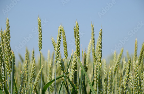 Spikelets of green wheat. Ripening wheat in the field.