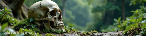 Spine-worn skull with vines and moss growing from its cracks, weathered stone, overgrown landscape,