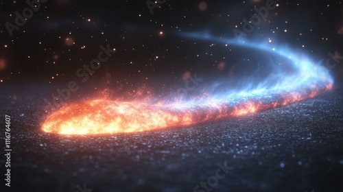 Spiral galaxy with glowing bright core and blue star arms, cosmic space scene for astronomy, science, technology, universe exploration background with dark starry sky and glowing particles