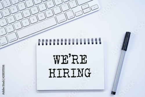 Spiral notebook with "We're hiring" text on keyboard on white background. Recruitment concept. Top view or flat lay.