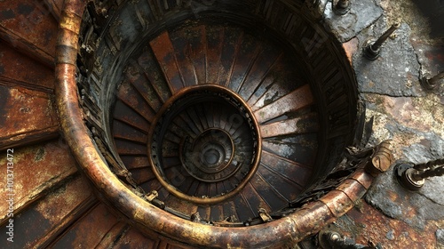 Spiral staircase with aged metal and wood texture, top view.
