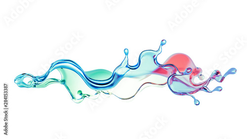 Splash of color rainbow transparent liquid on a white background. 3d illustration, 3d rendering.