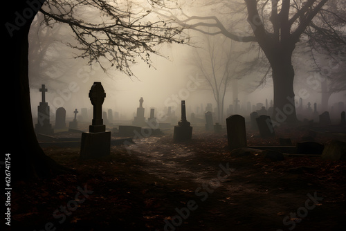spooky cemetery in fog
