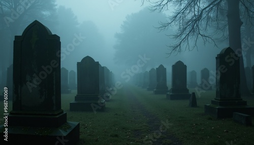 Spooky Cemetery with Fog Rolling Over Ancient, Moss-Covered Gravestones