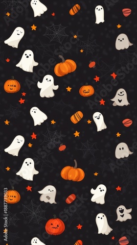 Spooky halloween seamless pattern with whimsical ghosts and carved pumpkins perfect for seasonal decorations and festive craft projects.