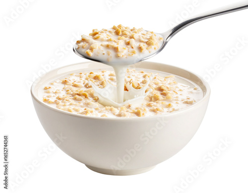 Spoon Splashing into Creamy Oatmeal, Side View with Dynamic Motion, isolated