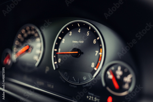 Sports car tachometer and dashboard with backlight. Close-up view of the modern car dashboard. Arrow of speedometer of supercar