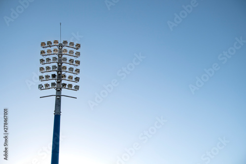 sky, light, stadium, blue, lamp, pole, lighting, energy, light, tower, street, power, electricity, metal, building, spotlight, high, electric, cloud, solar, sport, bright, construction, weather, day, sunny, floodlight, lighting equipment, field, venue, off, football, event, sporting, no people, outdoors