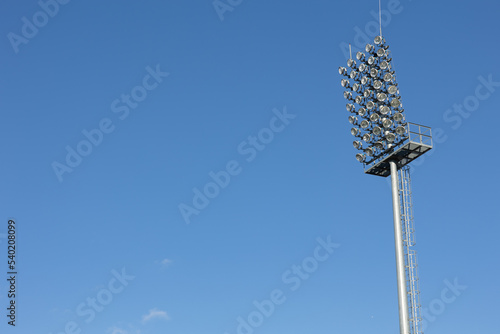 Sports stadium lighting system. The lights of a football stadium, are not in use. Light tower with many luminous projectors to illuminate the night sports event at the stadium.