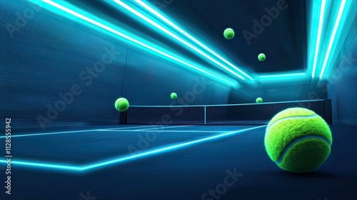 Sports Tennis concept. A futuristic tennis court with glowing neon lights and tennis balls in motion.