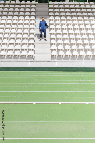 sportsman, standing, chair, stadium, copy space, 1, people, sport, travel, adult, man, journey, spain, day, outdoors, sunlight, light, athlete, active, lifestyle, sport, track, athletic, activewear, plaid, bleacher, mid, fitness, seat, caucasian, row, step, staircase, stair, green, colours, white, race track, arrival, male