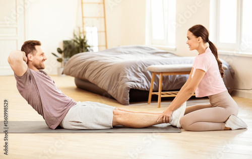 physical exercise, training, couple, caucasian, fitness, home, happy, exercise, young, girl, abdominal, activewear, background, 2, fit, weight loss, man, male, bedchamber, guy, family, body, indoor, activity, gym, person, sporty, healthy, modern, adult, well-being, concept, online, lifestyle, woman, homelike, leisure, white, smile, aerobic, abs, muscle, sport, people, wellness, domestic, together