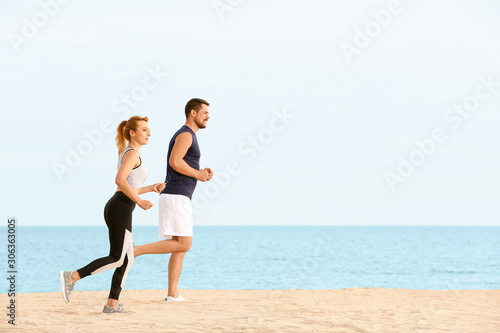 Sporty couple running at sea resort