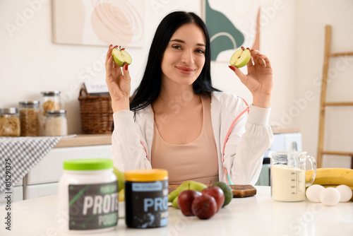 Sporty young woman with cut apple making protein shake in kitchen