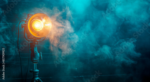 spotlight, illumination, smoke, background, concept, creative, light, dark, stage, studio, equipment, lighting, yellow, blue, cinema, film, theatrical, effect, atmosphere, ambient, moody, dramatic, performance, show, production, lens, glow, beam, industry, screen, artistic, flare, cinematography, brightness, fog, haze, entertainment, electricity, metal, glasses, photo, photo, shoot, mist, foggy, ai, generative, illustration