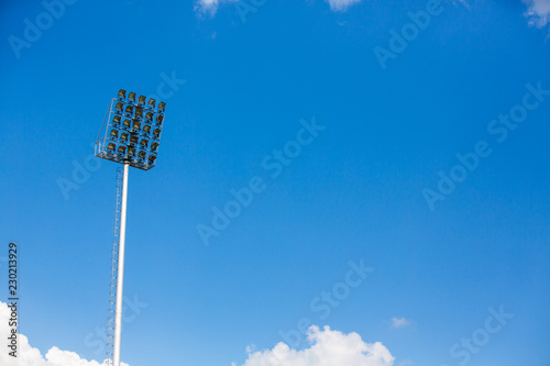 Spotlight tower at sport stadium with blue sky and cloud background, Copy space