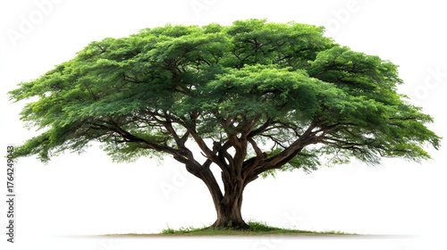 Sprawling acacia tree displays dense, vibrant green foliage against a stark white background