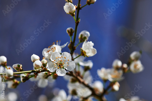 Spring impressions with fruit blossoms in the sunshine in front of a blurred background.