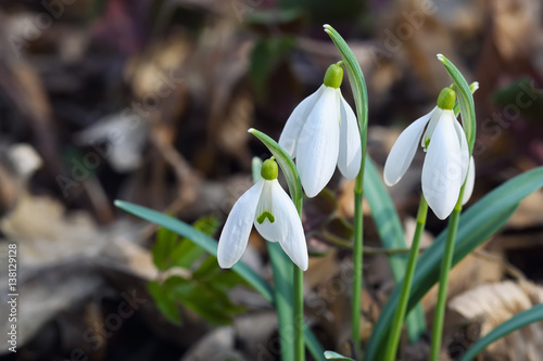 Spring snowdrop flowers blooming in sunny day