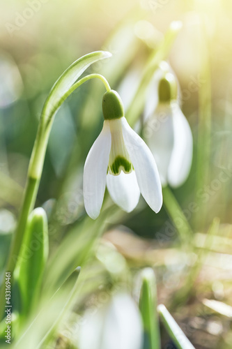 Spring snowdrops flower. Early spring close-up flowers with bright sunlight