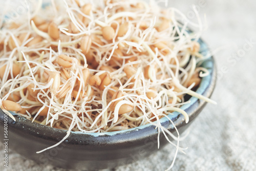 Sprouted wheat grains in a bowl on a linen napkin. Selective focus.