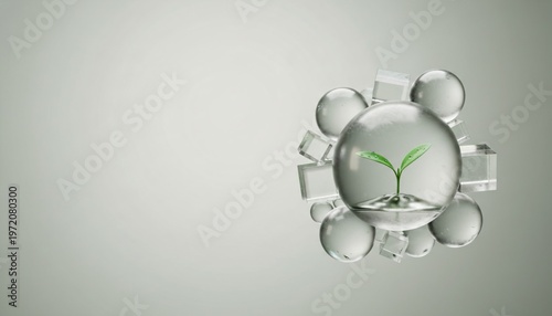 grey background, growth, development, finance, innovation, technology, ecology, environment, sustainability, isolated, white, minimalistic, modern, futuristic, sphere, cube, abstract, hope, green, transparent, object, shape, gradient, shadow, light, business, economy, environmental, digital artwork, white background, environmentally friendly, conceptual