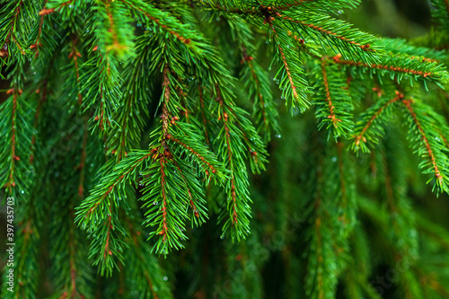 Spruce branches closeup (Caucasian Spruce, Oriental Spruce), green conifer tree twigs