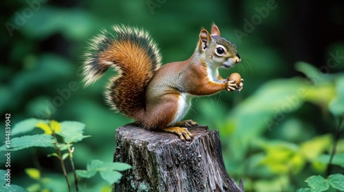 Squirrel on stump holding nut, blurred green forest background.