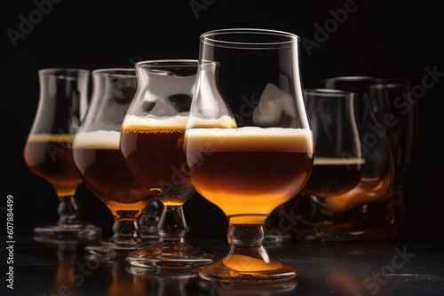 stack of beer glasses with foamy head and rich amber liquid, created with generative ai