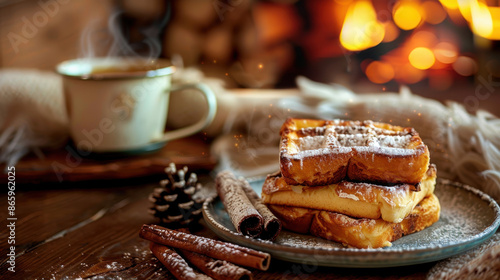 Stack of Belgian waffles with powdered sugar and cinnamon sticks near a steaming cup of coffee beside a fireplace