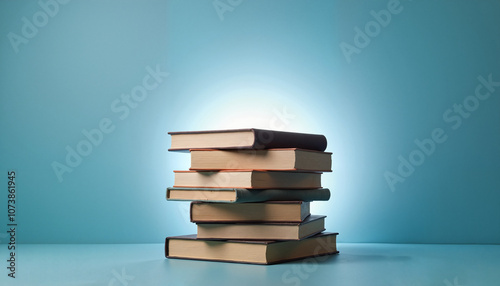 Stack of books illuminated from behind against a soft blue background, creating a dramatic effect
